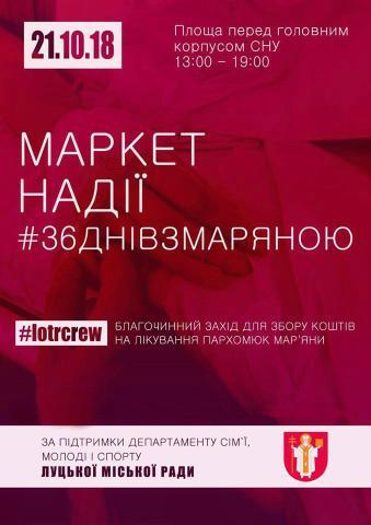 21 жовтня за підтримки департаменту сім'ї, молоді та спорту на площі перед головним корпусом СНУ імені Лесі Українки з 13:00 по 19:00 відбуватиметься благодійний МАРКЕТ НАДІЇ - #36днівзМаряною.