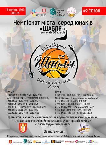 Вже завтра в приміщенні ЗЗСО № 24 (вул. Станіславського, 52 а) відбудеться ІІ тур чемпіонату міста Луцька з баскетболу серед юнаків "Шабля". Початок о 12.00 годині.