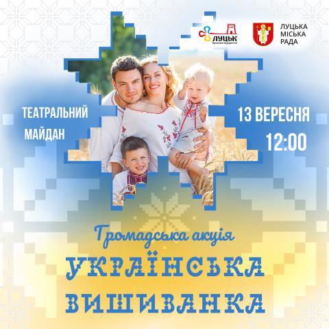 Запрошуємо Вас приєднатися до нашої улюбленої громадської акції «Українська вишиванка», яка щороку гуртує громаду навколо спільної любові до рідного. Цьогоріч акція відбуватиметься з нагоди Дня міста Луцьк.