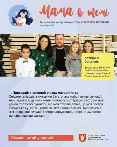 Героїнею сьогоднішнього дня є Катерина Семенюк, кураторка проекту «English Plus», волонтерка ВОГО «МИ ПЛЮС», мотиваційна спікерка, перекладачка, музикантка, дружина та мама Вікторії, Олени, Давида та Бетті.