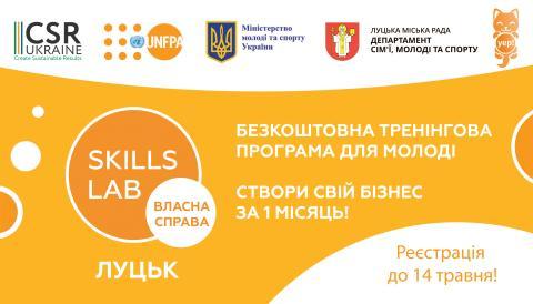 Центр “Розвиток КСВ” і Фонд ООН у галузі народонаселення за підтримки Міністерства молоді та спорту розробили програму Skills Lab: Власна справа. Партнери: департамент сім’ї, молоді та спорту Луцької міської ради, Луцький міський молодіжний центр, EENU StartUp Club YEP.