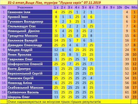 Результати та стан турнірної таблиці після 6 етапу (31-го етапу) турніру з тенісу настільного "Луцька серія" (вища ліга), що
