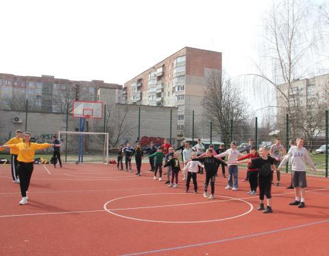 Захід розпочався на спортивному майданчику (вул. Кравчука, 26) з енергійної руханки, після якої дітям запропонували взяти участь у "Веселих стартах".