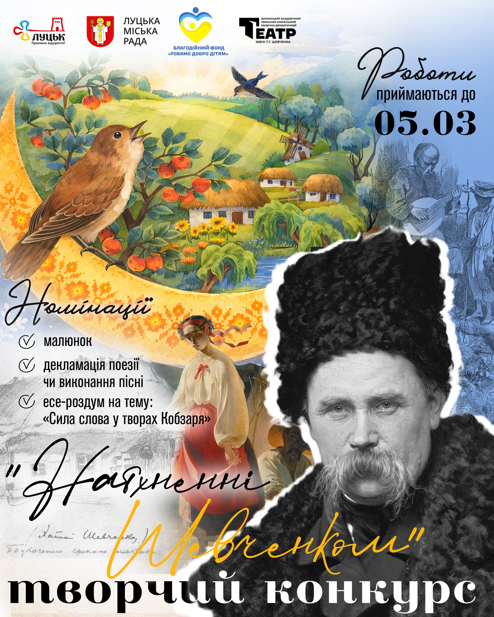 З нагоди 212-ї річниці від Дня народження Тараса Григоровича Шевченка запрошуємо дітей та учнівську молодь Луцької громади взяти участь у загальноміському творчому конкурсі!
