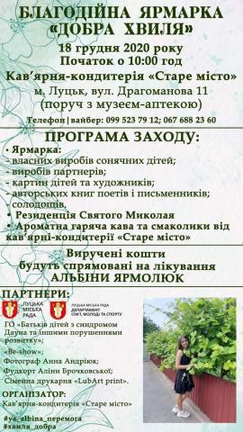 Департамент сім’ї, молоді та спорту Луцької міської ради спільно з арт-локацією "Творчий калейдоскоп" долучається до організації та проведення благодійної ярмарки «Добра хвиля», що відбудеться 18 грудня 2020 року.