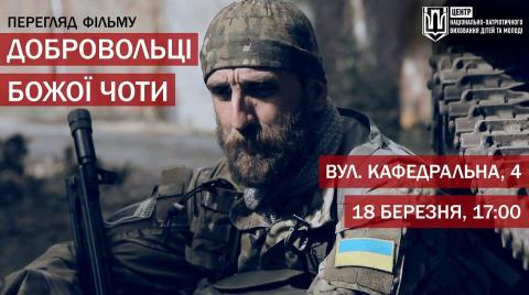 18 березня (понеділок) о 16:00 у Центр національно-патріотичного виховання дітей та молоді у м. Луцьк відбудеться перегляд документальної стрічки Леоніда Кантера та Івана Яснія ''Добровольці Божої Чоти''.